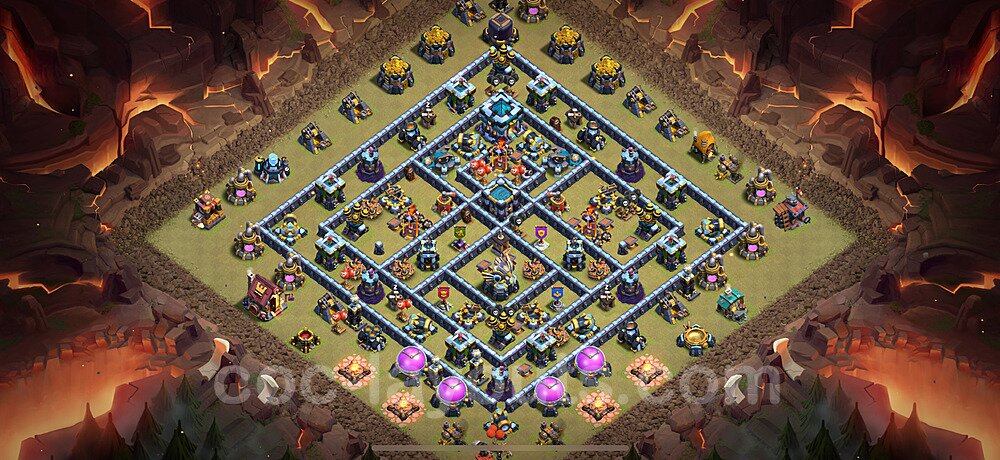 This Town Hall 13 war base is specifically designed to defend against 2-star and 3-star attacks in Clan Wars and Clan War Leagues. The strategic placement of defenses creates multiple compartments that force attackers to use more troops and spells than anticipated. Key defensive structures like Eagle Artillery, Inferno Towers, and X-Bows are positioned to cover crucial sections of the base, making it extremely difficult for opponents to secure a perfect attack. The core of this war base features a centralized Town Hall and Clan Castle, protected by multiple layers of walls and high-damage defenses. This layout forces attackers to commit significant resources just to reach the center, often leaving them without enough firepower to secure the Town Hall destruction. The anti-2-star design ensures that even if attackers breach the outer defenses, they'll struggle to achieve a 50% destruction rating. Air defenses are strategically spread to counter popular air attack strategies like LaLoon (Lava Hound + Balloons) and Electrone (Electro Dragons + Stone Slammer). The symmetrical trap placement and strategic Hidden Tesla positions create deadly surprise elements that can completely derail an attacker's plan. This base has been tested against various meta attack strategies and has consistently proven effective in preventing 3-star attacks.