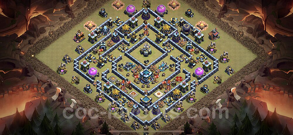 This Town Hall 13 war base is specifically designed to defend against 2-star and 3-star attacks in Clan Wars and Clan War Leagues. The strategic placement of defenses creates multiple compartments that force attackers to use more troops and spells than anticipated. Key defensive structures like Eagle Artillery, Inferno Towers, and X-Bows are positioned to cover crucial sections of the base, making it extremely difficult for opponents to secure a perfect attack. The core of this war base features a centralized Town Hall and Clan Castle, protected by multiple layers of walls and high-damage defenses. This layout forces attackers to commit significant resources just to reach the center, often leaving them without enough firepower to secure the Town Hall destruction. The anti-2-star design ensures that even if attackers breach the outer defenses, they'll struggle to achieve a 50% destruction rating. Air defenses are strategically spread to counter popular air attack strategies like LaLoon (Lava Hound + Balloons) and Electrone (Electro Dragons + Stone Slammer). The symmetrical trap placement and strategic Hidden Tesla positions create deadly surprise elements that can completely derail an attacker's plan. This base has been tested against various meta attack strategies and has consistently proven effective in preventing 3-star attacks.