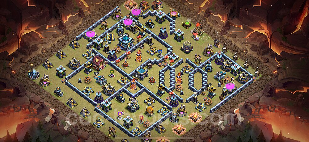 This Town Hall 13 war base is specifically designed to defend against 2-star and 3-star attacks in Clan Wars and Clan War Leagues. The strategic placement of defenses creates multiple compartments that force attackers to use more troops and spells than anticipated. Key defensive structures like Eagle Artillery, Inferno Towers, and X-Bows are positioned to cover crucial sections of the base, making it extremely difficult for opponents to secure a perfect attack. The core of this war base features a centralized Town Hall and Clan Castle, protected by multiple layers of walls and high-damage defenses. This layout forces attackers to commit significant resources just to reach the center, often leaving them without enough firepower to secure the Town Hall destruction. The anti-2-star design ensures that even if attackers breach the outer defenses, they'll struggle to achieve a 50% destruction rating. Air defenses are strategically spread to counter popular air attack strategies like LaLoon (Lava Hound + Balloons) and Electrone (Electro Dragons + Stone Slammer). The symmetrical trap placement and strategic Hidden Tesla positions create deadly surprise elements that can completely derail an attacker's plan. This base has been tested against various meta attack strategies and has consistently proven effective in preventing 3-star attacks.