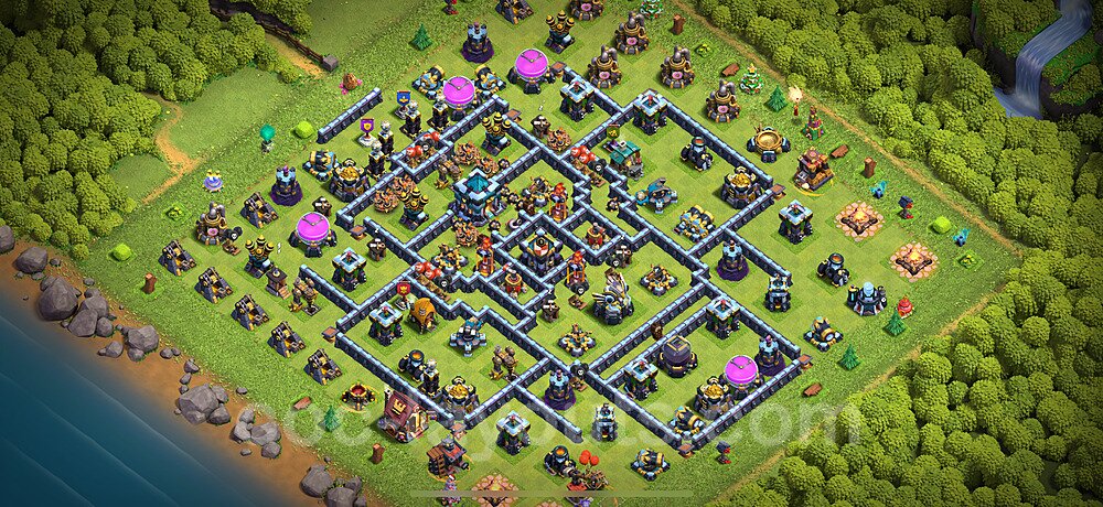 This Town Hall 13 war base is specifically designed to defend against 2-star and 3-star attacks in Clan Wars and Clan War Leagues. The strategic placement of defenses creates multiple compartments that force attackers to use more troops and spells than anticipated. Key defensive structures like Eagle Artillery, Inferno Towers, and X-Bows are positioned to cover crucial sections of the base, making it extremely difficult for opponents to secure a perfect attack. The core of this war base features a centralized Town Hall and Clan Castle, protected by multiple layers of walls and high-damage defenses. This layout forces attackers to commit significant resources just to reach the center, often leaving them without enough firepower to secure the Town Hall destruction. The anti-2-star design ensures that even if attackers breach the outer defenses, they'll struggle to achieve a 50% destruction rating. Air defenses are strategically spread to counter popular air attack strategies like LaLoon (Lava Hound + Balloons) and Electrone (Electro Dragons + Stone Slammer). The symmetrical trap placement and strategic Hidden Tesla positions create deadly surprise elements that can completely derail an attacker's plan. This base has been tested against various meta attack strategies and has consistently proven effective in preventing 3-star attacks.