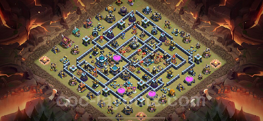 This Town Hall 13 war base is specifically designed to defend against 2-star and 3-star attacks in Clan Wars and Clan War Leagues. The strategic placement of defenses creates multiple compartments that force attackers to use more troops and spells than anticipated. Key defensive structures like Eagle Artillery, Inferno Towers, and X-Bows are positioned to cover crucial sections of the base, making it extremely difficult for opponents to secure a perfect attack. The core of this war base features a centralized Town Hall and Clan Castle, protected by multiple layers of walls and high-damage defenses. This layout forces attackers to commit significant resources just to reach the center, often leaving them without enough firepower to secure the Town Hall destruction. The anti-2-star design ensures that even if attackers breach the outer defenses, they'll struggle to achieve a 50% destruction rating. Air defenses are strategically spread to counter popular air attack strategies like LaLoon (Lava Hound + Balloons) and Electrone (Electro Dragons + Stone Slammer). The symmetrical trap placement and strategic Hidden Tesla positions create deadly surprise elements that can completely derail an attacker's plan. This base has been tested against various meta attack strategies and has consistently proven effective in preventing 3-star attacks.