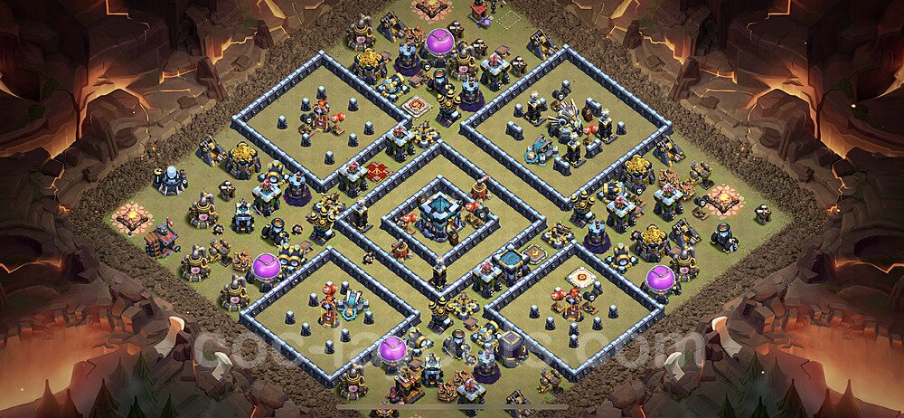 This Town Hall 13 war base is specifically designed to defend against 2-star and 3-star attacks in Clan Wars and Clan War Leagues. The strategic placement of defenses creates multiple compartments that force attackers to use more troops and spells than anticipated. Key defensive structures like Eagle Artillery, Inferno Towers, and X-Bows are positioned to cover crucial sections of the base, making it extremely difficult for opponents to secure a perfect attack. The core of this war base features a centralized Town Hall and Clan Castle, protected by multiple layers of walls and high-damage defenses. This layout forces attackers to commit significant resources just to reach the center, often leaving them without enough firepower to secure the Town Hall destruction. The anti-2-star design ensures that even if attackers breach the outer defenses, they'll struggle to achieve a 50% destruction rating. Air defenses are strategically spread to counter popular air attack strategies like LaLoon (Lava Hound + Balloons) and Electrone (Electro Dragons + Stone Slammer). The symmetrical trap placement and strategic Hidden Tesla positions create deadly surprise elements that can completely derail an attacker's plan. This base has been tested against various meta attack strategies and has consistently proven effective in preventing 3-star attacks.