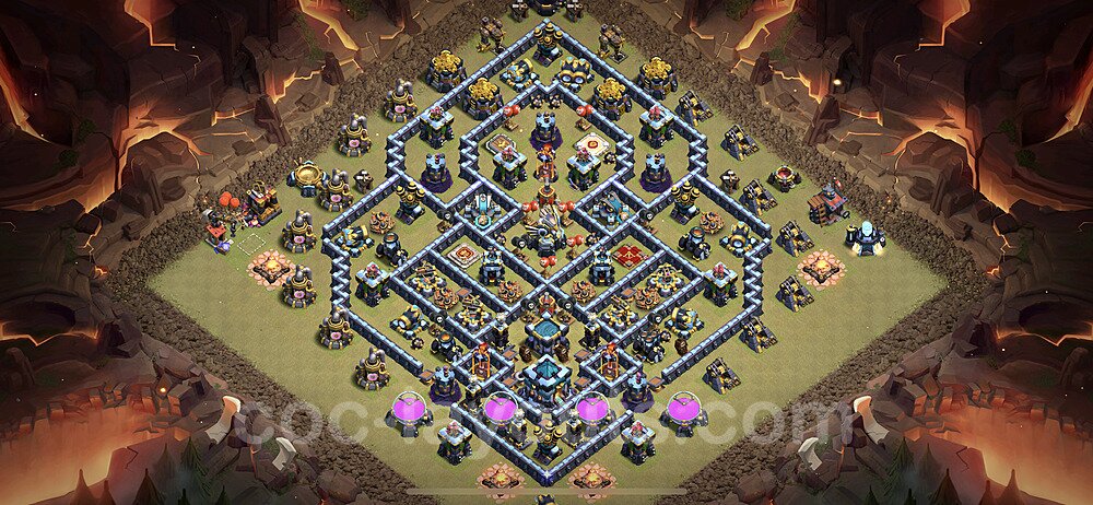 This Town Hall 13 war base is specifically designed to defend against 2-star and 3-star attacks in Clan Wars and Clan War Leagues. The strategic placement of defenses creates multiple compartments that force attackers to use more troops and spells than anticipated. Key defensive structures like Eagle Artillery, Inferno Towers, and X-Bows are positioned to cover crucial sections of the base, making it extremely difficult for opponents to secure a perfect attack. The core of this war base features a centralized Town Hall and Clan Castle, protected by multiple layers of walls and high-damage defenses. This layout forces attackers to commit significant resources just to reach the center, often leaving them without enough firepower to secure the Town Hall destruction. The anti-2-star design ensures that even if attackers breach the outer defenses, they'll struggle to achieve a 50% destruction rating. Air defenses are strategically spread to counter popular air attack strategies like LaLoon (Lava Hound + Balloons) and Electrone (Electro Dragons + Stone Slammer). The symmetrical trap placement and strategic Hidden Tesla positions create deadly surprise elements that can completely derail an attacker's plan. This base has been tested against various meta attack strategies and has consistently proven effective in preventing 3-star attacks.
