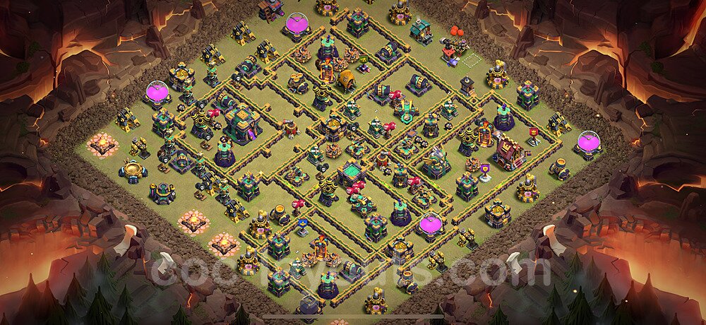 This Town Hall 14 war base is specifically designed to defend against 2-star and 3-star attacks in Clan Wars and Clan War Leagues. The strategic placement of defenses creates multiple compartments that force attackers to use more troops and spells than anticipated. Key defensive structures like Eagle Artillery, Inferno Towers, and X-Bows are positioned to cover crucial sections of the base, making it extremely difficult for opponents to secure a perfect attack. The core of this war base features a centralized Town Hall and Clan Castle, protected by multiple layers of walls and high-damage defenses. This layout forces attackers to commit significant resources just to reach the center, often leaving them without enough firepower to secure the Town Hall destruction. The anti-2-star design ensures that even if attackers breach the outer defenses, they'll struggle to achieve a 50% destruction rating. Air defenses are strategically spread to counter popular air attack strategies like LaLoon (Lava Hound + Balloons) and Electrone (Electro Dragons + Stone Slammer). The symmetrical trap placement and strategic Hidden Tesla positions create deadly surprise elements that can completely derail an attacker's plan. This base has been tested against various meta attack strategies and has consistently proven effective in preventing 3-star attacks.
