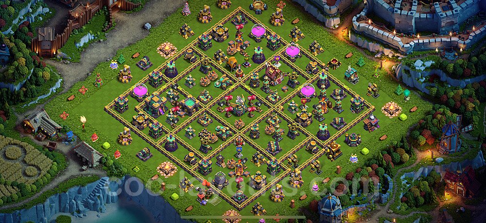 This Town Hall 14 war base is specifically designed to defend against 2-star and 3-star attacks in Clan Wars and Clan War Leagues. The strategic placement of defenses creates multiple compartments that force attackers to use more troops and spells than anticipated. Key defensive structures like Eagle Artillery, Inferno Towers, and X-Bows are positioned to cover crucial sections of the base, making it extremely difficult for opponents to secure a perfect attack. The core of this war base features a centralized Town Hall and Clan Castle, protected by multiple layers of walls and high-damage defenses. This layout forces attackers to commit significant resources just to reach the center, often leaving them without enough firepower to secure the Town Hall destruction. The anti-2-star design ensures that even if attackers breach the outer defenses, they'll struggle to achieve a 50% destruction rating. Air defenses are strategically spread to counter popular air attack strategies like LaLoon (Lava Hound + Balloons) and Electrone (Electro Dragons + Stone Slammer). The symmetrical trap placement and strategic Hidden Tesla positions create deadly surprise elements that can completely derail an attacker's plan. This base has been tested against various meta attack strategies and has consistently proven effective in preventing 3-star attacks.