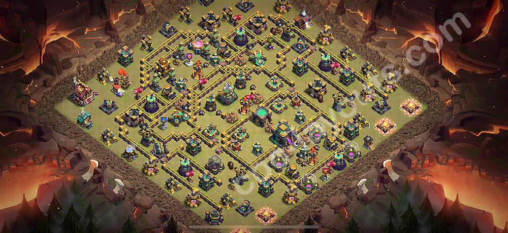 This Town Hall 14 war base is specifically designed to defend against 2-star and 3-star attacks in Clan Wars and Clan War Leagues. The strategic placement of defenses creates multiple compartments that force attackers to use more troops and spells than anticipated. Key defensive structures like Eagle Artillery, Inferno Towers, and X-Bows are positioned to cover crucial sections of the base, making it extremely difficult for opponents to secure a perfect attack. The core of this war base features a centralized Town Hall and Clan Castle, protected by multiple layers of walls and high-damage defenses. This layout forces attackers to commit significant resources just to reach the center, often leaving them without enough firepower to secure the Town Hall destruction. The anti-2-star design ensures that even if attackers breach the outer defenses, they'll struggle to achieve a 50% destruction rating. Air defenses are strategically spread to counter popular air attack strategies like LaLoon (Lava Hound + Balloons) and Electrone (Electro Dragons + Stone Slammer). The symmetrical trap placement and strategic Hidden Tesla positions create deadly surprise elements that can completely derail an attacker's plan. This base has been tested against various meta attack strategies and has consistently proven effective in preventing 3-star attacks.