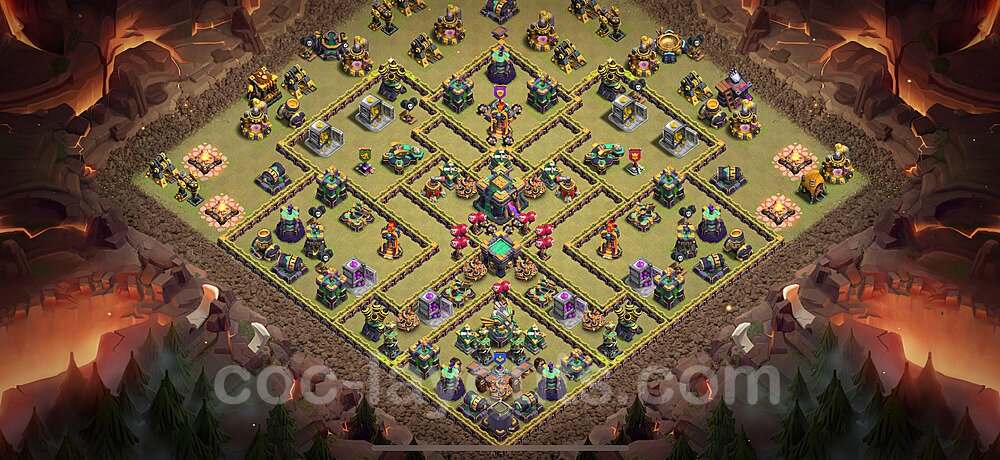 This Town Hall 14 war base is specifically designed to defend against 2-star and 3-star attacks in Clan Wars and Clan War Leagues. The strategic placement of defenses creates multiple compartments that force attackers to use more troops and spells than anticipated. Key defensive structures like Eagle Artillery, Inferno Towers, and X-Bows are positioned to cover crucial sections of the base, making it extremely difficult for opponents to secure a perfect attack. The core of this war base features a centralized Town Hall and Clan Castle, protected by multiple layers of walls and high-damage defenses. This layout forces attackers to commit significant resources just to reach the center, often leaving them without enough firepower to secure the Town Hall destruction. The anti-2-star design ensures that even if attackers breach the outer defenses, they'll struggle to achieve a 50% destruction rating. Air defenses are strategically spread to counter popular air attack strategies like LaLoon (Lava Hound + Balloons) and Electrone (Electro Dragons + Stone Slammer). The symmetrical trap placement and strategic Hidden Tesla positions create deadly surprise elements that can completely derail an attacker's plan. This base has been tested against various meta attack strategies and has consistently proven effective in preventing 3-star attacks.