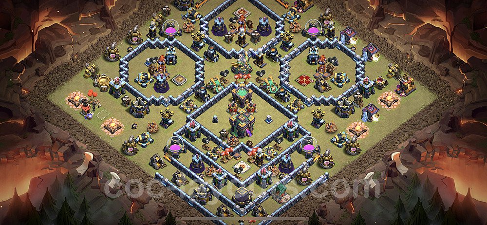 This Town Hall 14 war base is specifically designed to defend against 2-star and 3-star attacks in Clan Wars and Clan War Leagues. The strategic placement of defenses creates multiple compartments that force attackers to use more troops and spells than anticipated. Key defensive structures like Eagle Artillery, Inferno Towers, and X-Bows are positioned to cover crucial sections of the base, making it extremely difficult for opponents to secure a perfect attack. The core of this war base features a centralized Town Hall and Clan Castle, protected by multiple layers of walls and high-damage defenses. This layout forces attackers to commit significant resources just to reach the center, often leaving them without enough firepower to secure the Town Hall destruction. The anti-2-star design ensures that even if attackers breach the outer defenses, they'll struggle to achieve a 50% destruction rating. Air defenses are strategically spread to counter popular air attack strategies like LaLoon (Lava Hound + Balloons) and Electrone (Electro Dragons + Stone Slammer). The symmetrical trap placement and strategic Hidden Tesla positions create deadly surprise elements that can completely derail an attacker's plan. This base has been tested against various meta attack strategies and has consistently proven effective in preventing 3-star attacks.
