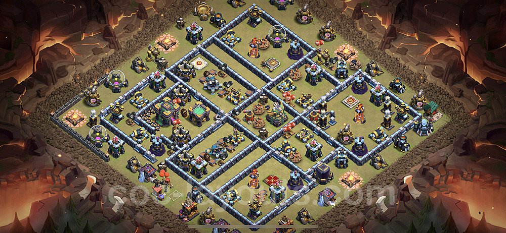 This Town Hall 14 war base is specifically designed to defend against 2-star and 3-star attacks in Clan Wars and Clan War Leagues. The strategic placement of defenses creates multiple compartments that force attackers to use more troops and spells than anticipated. Key defensive structures like Eagle Artillery, Inferno Towers, and X-Bows are positioned to cover crucial sections of the base, making it extremely difficult for opponents to secure a perfect attack. The core of this war base features a centralized Town Hall and Clan Castle, protected by multiple layers of walls and high-damage defenses. This layout forces attackers to commit significant resources just to reach the center, often leaving them without enough firepower to secure the Town Hall destruction. The anti-2-star design ensures that even if attackers breach the outer defenses, they'll struggle to achieve a 50% destruction rating. Air defenses are strategically spread to counter popular air attack strategies like LaLoon (Lava Hound + Balloons) and Electrone (Electro Dragons + Stone Slammer). The symmetrical trap placement and strategic Hidden Tesla positions create deadly surprise elements that can completely derail an attacker's plan. This base has been tested against various meta attack strategies and has consistently proven effective in preventing 3-star attacks.