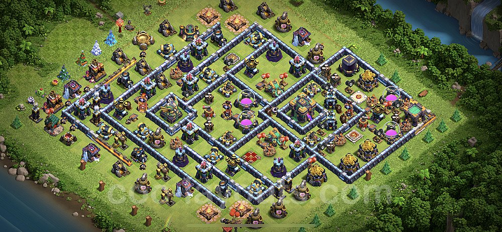 This Town Hall 14 hybrid base offers the best of both worlds - strong resource protection combined with effective trophy defense. The versatile design makes it an excellent choice for players who want to protect their loot while maintaining their trophy count. This balanced approach ensures you don't sacrifice one aspect of defense for another, making it ideal for active players across all league levels. The hybrid layout features centralized resource storages alongside a well-protected Town Hall, with multiple defensive layers that deter both farming raids and trophy pushers. High-value targets are strategically positioned within overlapping defense ranges, forcing attackers to make difficult choices about which objectives to prioritize. The compartmentalized design prevents attackers from easily achieving both loot destruction and the Town Hall kill in a single attack. Defense placement in this hybrid base creates strong coverage against both ground and air attacks. Inferno Towers, X-Bows, and Eagle Artillery work in concert to eliminate threats quickly, while splash damage defenses like Wizard Towers and Bomb Towers counter swarm strategies. The base's funnel-resistant design and strategic trap placement make it effective against popular attack strategies including QC LaLoon (Queen Charge Lava Hound Balloon), Blizzard attacks, and Yeti Smash compositions.