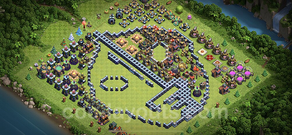 This Town Hall 14 war base is specifically designed to defend against 2-star and 3-star attacks in Clan Wars and Clan War Leagues. The strategic placement of defenses creates multiple compartments that force attackers to use more troops and spells than anticipated. Key defensive structures like Eagle Artillery, Inferno Towers, and X-Bows are positioned to cover crucial sections of the base, making it extremely difficult for opponents to secure a perfect attack. The core of this war base features a centralized Town Hall and Clan Castle, protected by multiple layers of walls and high-damage defenses. This layout forces attackers to commit significant resources just to reach the center, often leaving them without enough firepower to secure the Town Hall destruction. The anti-2-star design ensures that even if attackers breach the outer defenses, they'll struggle to achieve a 50% destruction rating. Air defenses are strategically spread to counter popular air attack strategies like LaLoon (Lava Hound + Balloons) and Electrone (Electro Dragons + Stone Slammer). The symmetrical trap placement and strategic Hidden Tesla positions create deadly surprise elements that can completely derail an attacker's plan. This base has been tested against various meta attack strategies and has consistently proven effective in preventing 3-star attacks.