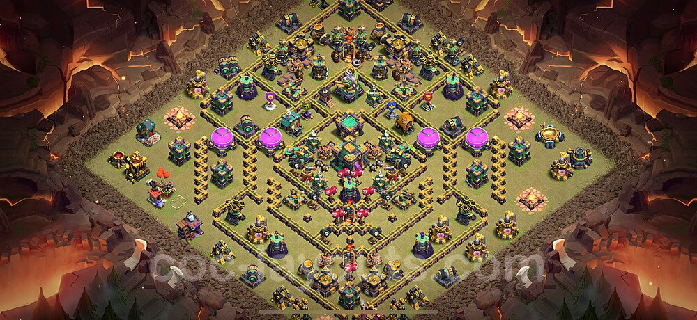 This Town Hall 14 war base is specifically designed to defend against 2-star and 3-star attacks in Clan Wars and Clan War Leagues. The strategic placement of defenses creates multiple compartments that force attackers to use more troops and spells than anticipated. Key defensive structures like Eagle Artillery, Inferno Towers, and X-Bows are positioned to cover crucial sections of the base, making it extremely difficult for opponents to secure a perfect attack. The core of this war base features a centralized Town Hall and Clan Castle, protected by multiple layers of walls and high-damage defenses. This layout forces attackers to commit significant resources just to reach the center, often leaving them without enough firepower to secure the Town Hall destruction. The anti-2-star design ensures that even if attackers breach the outer defenses, they'll struggle to achieve a 50% destruction rating. Air defenses are strategically spread to counter popular air attack strategies like LaLoon (Lava Hound + Balloons) and Electrone (Electro Dragons + Stone Slammer). The symmetrical trap placement and strategic Hidden Tesla positions create deadly surprise elements that can completely derail an attacker's plan. This base has been tested against various meta attack strategies and has consistently proven effective in preventing 3-star attacks.