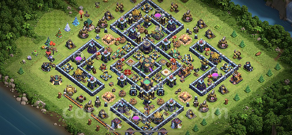This Town Hall 14 war base is specifically designed to defend against 2-star and 3-star attacks in Clan Wars and Clan War Leagues. The strategic placement of defenses creates multiple compartments that force attackers to use more troops and spells than anticipated. Key defensive structures like Eagle Artillery, Inferno Towers, and X-Bows are positioned to cover crucial sections of the base, making it extremely difficult for opponents to secure a perfect attack. The core of this war base features a centralized Town Hall and Clan Castle, protected by multiple layers of walls and high-damage defenses. This layout forces attackers to commit significant resources just to reach the center, often leaving them without enough firepower to secure the Town Hall destruction. The anti-2-star design ensures that even if attackers breach the outer defenses, they'll struggle to achieve a 50% destruction rating. Air defenses are strategically spread to counter popular air attack strategies like LaLoon (Lava Hound + Balloons) and Electrone (Electro Dragons + Stone Slammer). The symmetrical trap placement and strategic Hidden Tesla positions create deadly surprise elements that can completely derail an attacker's plan. This base has been tested against various meta attack strategies and has consistently proven effective in preventing 3-star attacks.