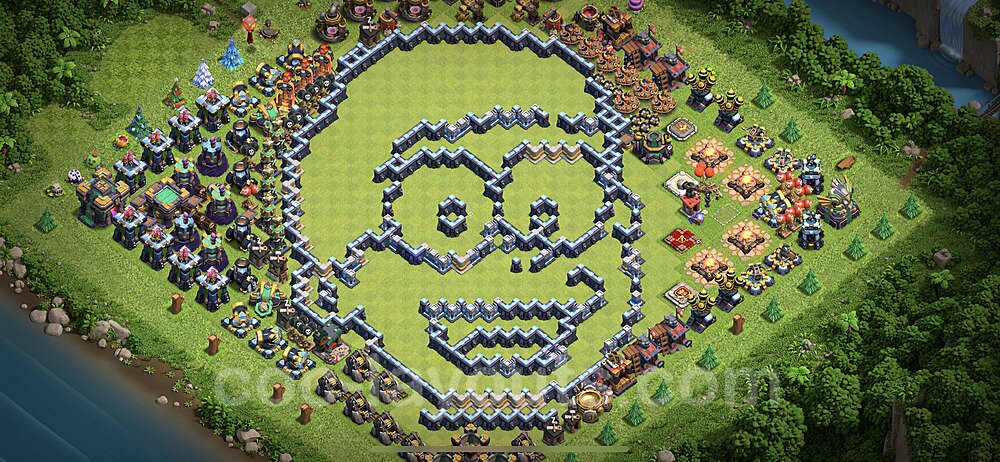 This Town Hall 14 war base is specifically designed to defend against 2-star and 3-star attacks in Clan Wars and Clan War Leagues. The strategic placement of defenses creates multiple compartments that force attackers to use more troops and spells than anticipated. Key defensive structures like Eagle Artillery, Inferno Towers, and X-Bows are positioned to cover crucial sections of the base, making it extremely difficult for opponents to secure a perfect attack. The core of this war base features a centralized Town Hall and Clan Castle, protected by multiple layers of walls and high-damage defenses. This layout forces attackers to commit significant resources just to reach the center, often leaving them without enough firepower to secure the Town Hall destruction. The anti-2-star design ensures that even if attackers breach the outer defenses, they'll struggle to achieve a 50% destruction rating. Air defenses are strategically spread to counter popular air attack strategies like LaLoon (Lava Hound + Balloons) and Electrone (Electro Dragons + Stone Slammer). The symmetrical trap placement and strategic Hidden Tesla positions create deadly surprise elements that can completely derail an attacker's plan. This base has been tested against various meta attack strategies and has consistently proven effective in preventing 3-star attacks.