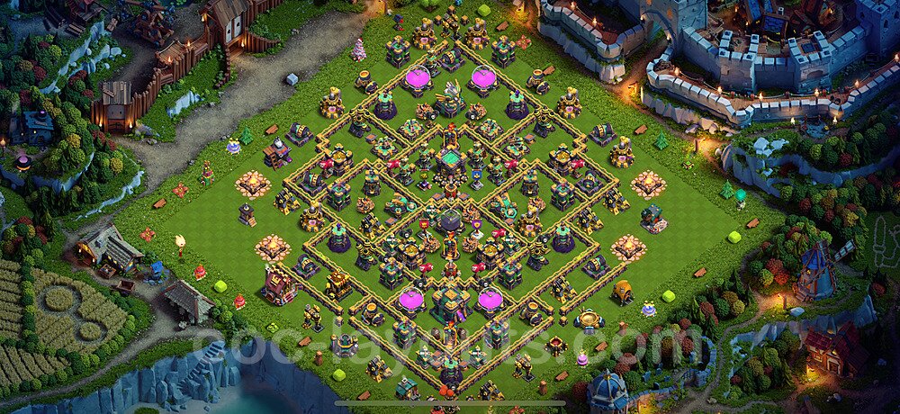 This Town Hall 14 hybrid base offers the best of both worlds - strong resource protection combined with effective trophy defense. The versatile design makes it an excellent choice for players who want to protect their loot while maintaining their trophy count. This balanced approach ensures you don't sacrifice one aspect of defense for another, making it ideal for active players across all league levels. The hybrid layout features centralized resource storages alongside a well-protected Town Hall, with multiple defensive layers that deter both farming raids and trophy pushers. High-value targets are strategically positioned within overlapping defense ranges, forcing attackers to make difficult choices about which objectives to prioritize. The compartmentalized design prevents attackers from easily achieving both loot destruction and the Town Hall kill in a single attack. Defense placement in this hybrid base creates strong coverage against both ground and air attacks. Inferno Towers, X-Bows, and Eagle Artillery work in concert to eliminate threats quickly, while splash damage defenses like Wizard Towers and Bomb Towers counter swarm strategies. The base's funnel-resistant design and strategic trap placement make it effective against popular attack strategies including QC LaLoon (Queen Charge Lava Hound Balloon), Blizzard attacks, and Yeti Smash compositions.