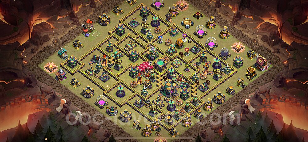 This Town Hall 14 hybrid base offers the best of both worlds - strong resource protection combined with effective trophy defense. The versatile design makes it an excellent choice for players who want to protect their loot while maintaining their trophy count. This balanced approach ensures you don't sacrifice one aspect of defense for another, making it ideal for active players across all league levels. The hybrid layout features centralized resource storages alongside a well-protected Town Hall, with multiple defensive layers that deter both farming raids and trophy pushers. High-value targets are strategically positioned within overlapping defense ranges, forcing attackers to make difficult choices about which objectives to prioritize. The compartmentalized design prevents attackers from easily achieving both loot destruction and the Town Hall kill in a single attack. Defense placement in this hybrid base creates strong coverage against both ground and air attacks. Inferno Towers, X-Bows, and Eagle Artillery work in concert to eliminate threats quickly, while splash damage defenses like Wizard Towers and Bomb Towers counter swarm strategies. The base's funnel-resistant design and strategic trap placement make it effective against popular attack strategies including QC LaLoon (Queen Charge Lava Hound Balloon), Blizzard attacks, and Yeti Smash compositions.