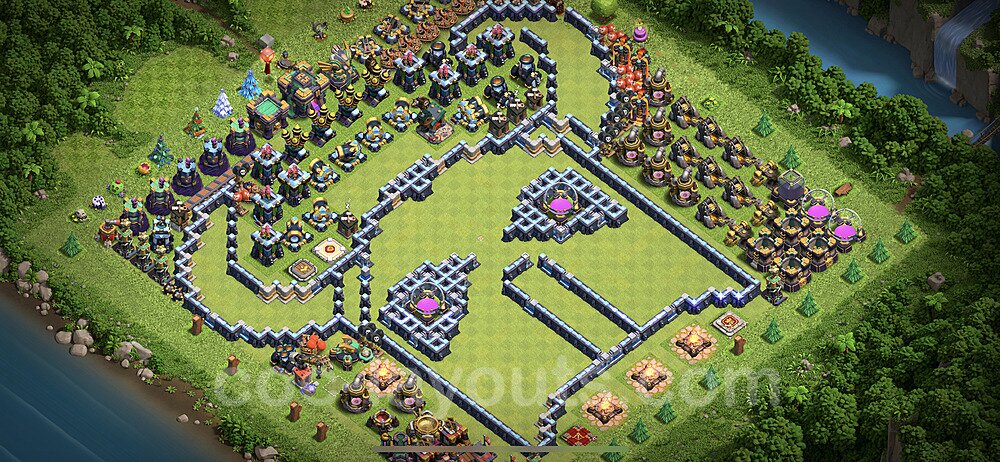This Town Hall 14 war base is specifically designed to defend against 2-star and 3-star attacks in Clan Wars and Clan War Leagues. The strategic placement of defenses creates multiple compartments that force attackers to use more troops and spells than anticipated. Key defensive structures like Eagle Artillery, Inferno Towers, and X-Bows are positioned to cover crucial sections of the base, making it extremely difficult for opponents to secure a perfect attack. The core of this war base features a centralized Town Hall and Clan Castle, protected by multiple layers of walls and high-damage defenses. This layout forces attackers to commit significant resources just to reach the center, often leaving them without enough firepower to secure the Town Hall destruction. The anti-2-star design ensures that even if attackers breach the outer defenses, they'll struggle to achieve a 50% destruction rating. Air defenses are strategically spread to counter popular air attack strategies like LaLoon (Lava Hound + Balloons) and Electrone (Electro Dragons + Stone Slammer). The symmetrical trap placement and strategic Hidden Tesla positions create deadly surprise elements that can completely derail an attacker's plan. This base has been tested against various meta attack strategies and has consistently proven effective in preventing 3-star attacks.