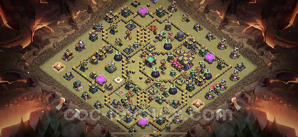 This Town Hall 14 war base is specifically designed to defend against 2-star and 3-star attacks in Clan Wars and Clan War Leagues. The strategic placement of defenses creates multiple compartments that force attackers to use more troops and spells than anticipated. Key defensive structures like Eagle Artillery, Inferno Towers, and X-Bows are positioned to cover crucial sections of the base, making it extremely difficult for opponents to secure a perfect attack. The core of this war base features a centralized Town Hall and Clan Castle, protected by multiple layers of walls and high-damage defenses. This layout forces attackers to commit significant resources just to reach the center, often leaving them without enough firepower to secure the Town Hall destruction. The anti-2-star design ensures that even if attackers breach the outer defenses, they'll struggle to achieve a 50% destruction rating. Air defenses are strategically spread to counter popular air attack strategies like LaLoon (Lava Hound + Balloons) and Electrone (Electro Dragons + Stone Slammer). The symmetrical trap placement and strategic Hidden Tesla positions create deadly surprise elements that can completely derail an attacker's plan. This base has been tested against various meta attack strategies and has consistently proven effective in preventing 3-star attacks.