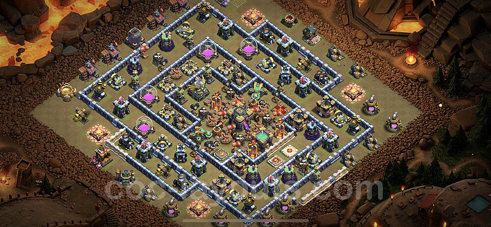 This Town Hall 14 war base is specifically designed to defend against 2-star and 3-star attacks in Clan Wars and Clan War Leagues. The strategic placement of defenses creates multiple compartments that force attackers to use more troops and spells than anticipated. Key defensive structures like Eagle Artillery, Inferno Towers, and X-Bows are positioned to cover crucial sections of the base, making it extremely difficult for opponents to secure a perfect attack. The core of this war base features a centralized Town Hall and Clan Castle, protected by multiple layers of walls and high-damage defenses. This layout forces attackers to commit significant resources just to reach the center, often leaving them without enough firepower to secure the Town Hall destruction. The anti-2-star design ensures that even if attackers breach the outer defenses, they'll struggle to achieve a 50% destruction rating. Air defenses are strategically spread to counter popular air attack strategies like LaLoon (Lava Hound + Balloons) and Electrone (Electro Dragons + Stone Slammer). The symmetrical trap placement and strategic Hidden Tesla positions create deadly surprise elements that can completely derail an attacker's plan. This base has been tested against various meta attack strategies and has consistently proven effective in preventing 3-star attacks.