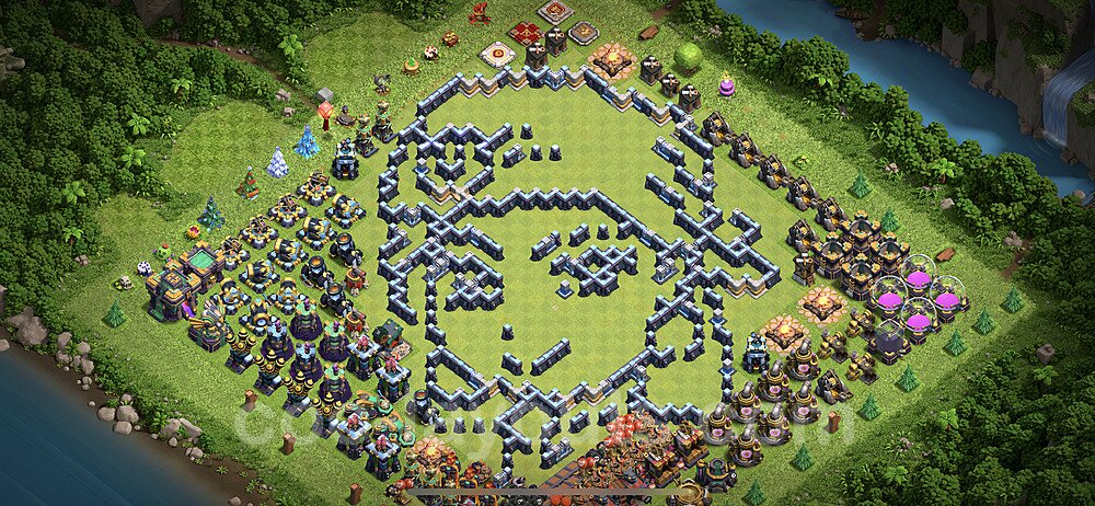 This Town Hall 14 war base is specifically designed to defend against 2-star and 3-star attacks in Clan Wars and Clan War Leagues. The strategic placement of defenses creates multiple compartments that force attackers to use more troops and spells than anticipated. Key defensive structures like Eagle Artillery, Inferno Towers, and X-Bows are positioned to cover crucial sections of the base, making it extremely difficult for opponents to secure a perfect attack. The core of this war base features a centralized Town Hall and Clan Castle, protected by multiple layers of walls and high-damage defenses. This layout forces attackers to commit significant resources just to reach the center, often leaving them without enough firepower to secure the Town Hall destruction. The anti-2-star design ensures that even if attackers breach the outer defenses, they'll struggle to achieve a 50% destruction rating. Air defenses are strategically spread to counter popular air attack strategies like LaLoon (Lava Hound + Balloons) and Electrone (Electro Dragons + Stone Slammer). The symmetrical trap placement and strategic Hidden Tesla positions create deadly surprise elements that can completely derail an attacker's plan. This base has been tested against various meta attack strategies and has consistently proven effective in preventing 3-star attacks.