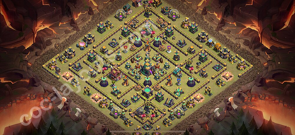 This Town Hall 14 war base is specifically designed to defend against 2-star and 3-star attacks in Clan Wars and Clan War Leagues. The strategic placement of defenses creates multiple compartments that force attackers to use more troops and spells than anticipated. Key defensive structures like Eagle Artillery, Inferno Towers, and X-Bows are positioned to cover crucial sections of the base, making it extremely difficult for opponents to secure a perfect attack. The core of this war base features a centralized Town Hall and Clan Castle, protected by multiple layers of walls and high-damage defenses. This layout forces attackers to commit significant resources just to reach the center, often leaving them without enough firepower to secure the Town Hall destruction. The anti-2-star design ensures that even if attackers breach the outer defenses, they'll struggle to achieve a 50% destruction rating. Air defenses are strategically spread to counter popular air attack strategies like LaLoon (Lava Hound + Balloons) and Electrone (Electro Dragons + Stone Slammer). The symmetrical trap placement and strategic Hidden Tesla positions create deadly surprise elements that can completely derail an attacker's plan. This base has been tested against various meta attack strategies and has consistently proven effective in preventing 3-star attacks.