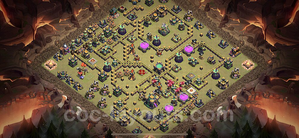 This Town Hall 14 war base is specifically designed to defend against 2-star and 3-star attacks in Clan Wars and Clan War Leagues. The strategic placement of defenses creates multiple compartments that force attackers to use more troops and spells than anticipated. Key defensive structures like Eagle Artillery, Inferno Towers, and X-Bows are positioned to cover crucial sections of the base, making it extremely difficult for opponents to secure a perfect attack. The core of this war base features a centralized Town Hall and Clan Castle, protected by multiple layers of walls and high-damage defenses. This layout forces attackers to commit significant resources just to reach the center, often leaving them without enough firepower to secure the Town Hall destruction. The anti-2-star design ensures that even if attackers breach the outer defenses, they'll struggle to achieve a 50% destruction rating. Air defenses are strategically spread to counter popular air attack strategies like LaLoon (Lava Hound + Balloons) and Electrone (Electro Dragons + Stone Slammer). The symmetrical trap placement and strategic Hidden Tesla positions create deadly surprise elements that can completely derail an attacker's plan. This base has been tested against various meta attack strategies and has consistently proven effective in preventing 3-star attacks.