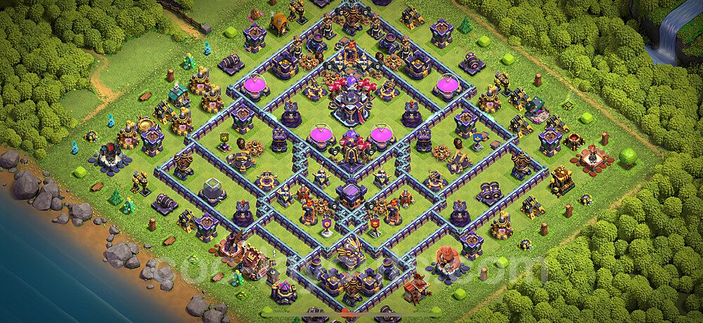 This Town Hall 15 hybrid base offers the best of both worlds - strong resource protection combined with effective trophy defense. The versatile design makes it an excellent choice for players who want to protect their loot while maintaining their trophy count. This balanced approach ensures you don't sacrifice one aspect of defense for another, making it ideal for active players across all league levels. The hybrid layout features centralized resource storages alongside a well-protected Town Hall, with multiple defensive layers that deter both farming raids and trophy pushers. High-value targets are strategically positioned within overlapping defense ranges, forcing attackers to make difficult choices about which objectives to prioritize. The compartmentalized design prevents attackers from easily achieving both loot destruction and the Town Hall kill in a single attack. Defense placement in this hybrid base creates strong coverage against both ground and air attacks. Inferno Towers, X-Bows, and Eagle Artillery work in concert to eliminate threats quickly, while splash damage defenses like Wizard Towers and Bomb Towers counter swarm strategies. The base's funnel-resistant design and strategic trap placement make it effective against popular attack strategies including QC LaLoon (Queen Charge Lava Hound Balloon), Blizzard attacks, and Yeti Smash compositions.