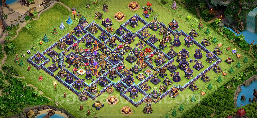 This Town Hall 15 hybrid base offers the best of both worlds - strong resource protection combined with effective trophy defense. The versatile design makes it an excellent choice for players who want to protect their loot while maintaining their trophy count. This balanced approach ensures you don't sacrifice one aspect of defense for another, making it ideal for active players across all league levels. The hybrid layout features centralized resource storages alongside a well-protected Town Hall, with multiple defensive layers that deter both farming raids and trophy pushers. High-value targets are strategically positioned within overlapping defense ranges, forcing attackers to make difficult choices about which objectives to prioritize. The compartmentalized design prevents attackers from easily achieving both loot destruction and the Town Hall kill in a single attack. Defense placement in this hybrid base creates strong coverage against both ground and air attacks. Inferno Towers, X-Bows, and Eagle Artillery work in concert to eliminate threats quickly, while splash damage defenses like Wizard Towers and Bomb Towers counter swarm strategies. The base's funnel-resistant design and strategic trap placement make it effective against popular attack strategies including QC LaLoon (Queen Charge Lava Hound Balloon), Blizzard attacks, and Yeti Smash compositions.