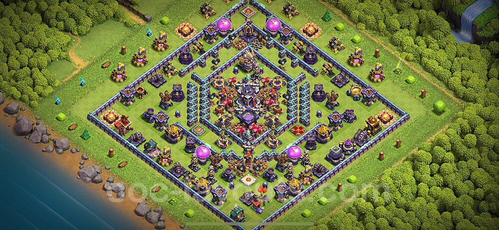 This Town Hall 15 hybrid base offers the best of both worlds - strong resource protection combined with effective trophy defense. The versatile design makes it an excellent choice for players who want to protect their loot while maintaining their trophy count. This balanced approach ensures you don't sacrifice one aspect of defense for another, making it ideal for active players across all league levels. The hybrid layout features centralized resource storages alongside a well-protected Town Hall, with multiple defensive layers that deter both farming raids and trophy pushers. High-value targets are strategically positioned within overlapping defense ranges, forcing attackers to make difficult choices about which objectives to prioritize. The compartmentalized design prevents attackers from easily achieving both loot destruction and the Town Hall kill in a single attack. Defense placement in this hybrid base creates strong coverage against both ground and air attacks. Inferno Towers, X-Bows, and Eagle Artillery work in concert to eliminate threats quickly, while splash damage defenses like Wizard Towers and Bomb Towers counter swarm strategies. The base's funnel-resistant design and strategic trap placement make it effective against popular attack strategies including QC LaLoon (Queen Charge Lava Hound Balloon), Blizzard attacks, and Yeti Smash compositions.