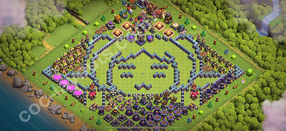 This Town Hall 15 war base is specifically designed to defend against 2-star and 3-star attacks in Clan Wars and Clan War Leagues. The strategic placement of defenses creates multiple compartments that force attackers to use more troops and spells than anticipated. Key defensive structures like Eagle Artillery, Inferno Towers, and X-Bows are positioned to cover crucial sections of the base, making it extremely difficult for opponents to secure a perfect attack. The core of this war base features a centralized Town Hall and Clan Castle, protected by multiple layers of walls and high-damage defenses. This layout forces attackers to commit significant resources just to reach the center, often leaving them without enough firepower to secure the Town Hall destruction. The anti-2-star design ensures that even if attackers breach the outer defenses, they'll struggle to achieve a 50% destruction rating. Air defenses are strategically spread to counter popular air attack strategies like LaLoon (Lava Hound + Balloons) and Electrone (Electro Dragons + Stone Slammer). The symmetrical trap placement and strategic Hidden Tesla positions create deadly surprise elements that can completely derail an attacker's plan. This base has been tested against various meta attack strategies and has consistently proven effective in preventing 3-star attacks.