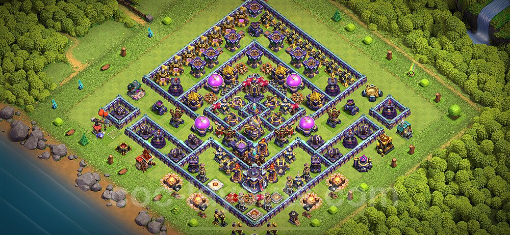 This Town Hall 15 war base is specifically designed to defend against 2-star and 3-star attacks in Clan Wars and Clan War Leagues. The strategic placement of defenses creates multiple compartments that force attackers to use more troops and spells than anticipated. Key defensive structures like Eagle Artillery, Inferno Towers, and X-Bows are positioned to cover crucial sections of the base, making it extremely difficult for opponents to secure a perfect attack. The core of this war base features a centralized Town Hall and Clan Castle, protected by multiple layers of walls and high-damage defenses. This layout forces attackers to commit significant resources just to reach the center, often leaving them without enough firepower to secure the Town Hall destruction. The anti-2-star design ensures that even if attackers breach the outer defenses, they'll struggle to achieve a 50% destruction rating. Air defenses are strategically spread to counter popular air attack strategies like LaLoon (Lava Hound + Balloons) and Electrone (Electro Dragons + Stone Slammer). The symmetrical trap placement and strategic Hidden Tesla positions create deadly surprise elements that can completely derail an attacker's plan. This base has been tested against various meta attack strategies and has consistently proven effective in preventing 3-star attacks.