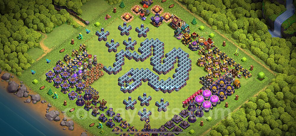 This Town Hall 15 war base is specifically designed to defend against 2-star and 3-star attacks in Clan Wars and Clan War Leagues. The strategic placement of defenses creates multiple compartments that force attackers to use more troops and spells than anticipated. Key defensive structures like Eagle Artillery, Inferno Towers, and X-Bows are positioned to cover crucial sections of the base, making it extremely difficult for opponents to secure a perfect attack. The core of this war base features a centralized Town Hall and Clan Castle, protected by multiple layers of walls and high-damage defenses. This layout forces attackers to commit significant resources just to reach the center, often leaving them without enough firepower to secure the Town Hall destruction. The anti-2-star design ensures that even if attackers breach the outer defenses, they'll struggle to achieve a 50% destruction rating. Air defenses are strategically spread to counter popular air attack strategies like LaLoon (Lava Hound + Balloons) and Electrone (Electro Dragons + Stone Slammer). The symmetrical trap placement and strategic Hidden Tesla positions create deadly surprise elements that can completely derail an attacker's plan. This base has been tested against various meta attack strategies and has consistently proven effective in preventing 3-star attacks.