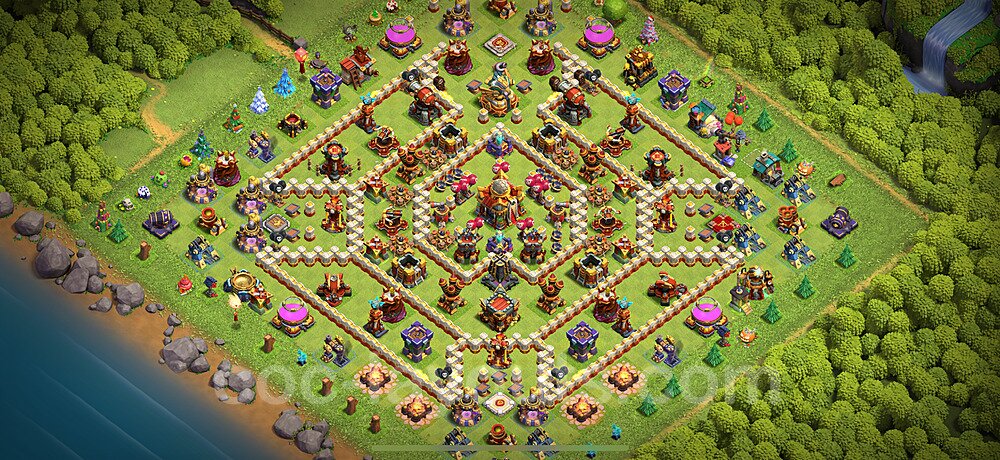 This Town Hall 16 war base is specifically designed to defend against 2-star and 3-star attacks in Clan Wars and Clan War Leagues. The strategic placement of defenses creates multiple compartments that force attackers to use more troops and spells than anticipated. Key defensive structures like Eagle Artillery, Inferno Towers, and X-Bows are positioned to cover crucial sections of the base, making it extremely difficult for opponents to secure a perfect attack. The core of this war base features a centralized Town Hall and Clan Castle, protected by multiple layers of walls and high-damage defenses. This layout forces attackers to commit significant resources just to reach the center, often leaving them without enough firepower to secure the Town Hall destruction. The anti-2-star design ensures that even if attackers breach the outer defenses, they'll struggle to achieve a 50% destruction rating. Air defenses are strategically spread to counter popular air attack strategies like LaLoon (Lava Hound + Balloons) and Electrone (Electro Dragons + Stone Slammer). The symmetrical trap placement and strategic Hidden Tesla positions create deadly surprise elements that can completely derail an attacker's plan. This base has been tested against various meta attack strategies and has consistently proven effective in preventing 3-star attacks.