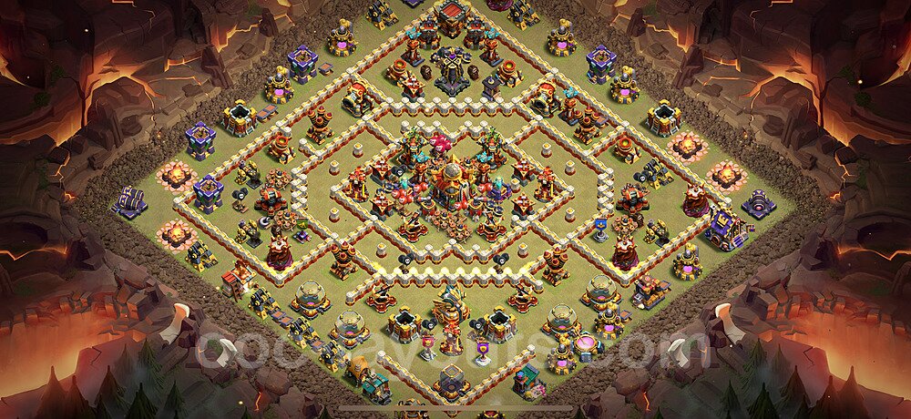 This Town Hall 16 war base is specifically designed to defend against 2-star and 3-star attacks in Clan Wars and Clan War Leagues. The strategic placement of defenses creates multiple compartments that force attackers to use more troops and spells than anticipated. Key defensive structures like Eagle Artillery, Inferno Towers, and X-Bows are positioned to cover crucial sections of the base, making it extremely difficult for opponents to secure a perfect attack. The core of this war base features a centralized Town Hall and Clan Castle, protected by multiple layers of walls and high-damage defenses. This layout forces attackers to commit significant resources just to reach the center, often leaving them without enough firepower to secure the Town Hall destruction. The anti-2-star design ensures that even if attackers breach the outer defenses, they'll struggle to achieve a 50% destruction rating. Air defenses are strategically spread to counter popular air attack strategies like LaLoon (Lava Hound + Balloons) and Electrone (Electro Dragons + Stone Slammer). The symmetrical trap placement and strategic Hidden Tesla positions create deadly surprise elements that can completely derail an attacker's plan. This base has been tested against various meta attack strategies and has consistently proven effective in preventing 3-star attacks.