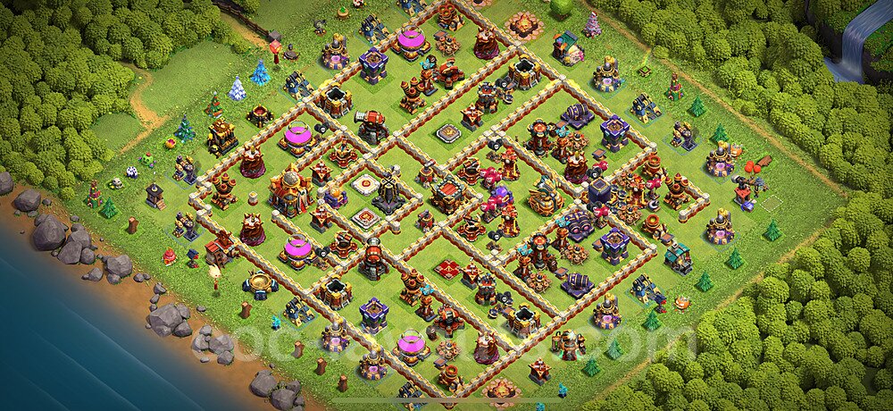This Town Hall 16 hybrid base offers the best of both worlds - strong resource protection combined with effective trophy defense. The versatile design makes it an excellent choice for players who want to protect their loot while maintaining their trophy count. This balanced approach ensures you don't sacrifice one aspect of defense for another, making it ideal for active players across all league levels. The hybrid layout features centralized resource storages alongside a well-protected Town Hall, with multiple defensive layers that deter both farming raids and trophy pushers. High-value targets are strategically positioned within overlapping defense ranges, forcing attackers to make difficult choices about which objectives to prioritize. The compartmentalized design prevents attackers from easily achieving both loot destruction and the Town Hall kill in a single attack. Defense placement in this hybrid base creates strong coverage against both ground and air attacks. Inferno Towers, X-Bows, and Eagle Artillery work in concert to eliminate threats quickly, while splash damage defenses like Wizard Towers and Bomb Towers counter swarm strategies. The base's funnel-resistant design and strategic trap placement make it effective against popular attack strategies including QC LaLoon (Queen Charge Lava Hound Balloon), Blizzard attacks, and Yeti Smash compositions.