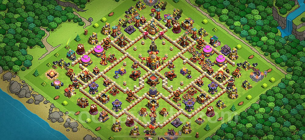 This Town Hall 16 hybrid base offers the best of both worlds - strong resource protection combined with effective trophy defense. The versatile design makes it an excellent choice for players who want to protect their loot while maintaining their trophy count. This balanced approach ensures you don't sacrifice one aspect of defense for another, making it ideal for active players across all league levels. The hybrid layout features centralized resource storages alongside a well-protected Town Hall, with multiple defensive layers that deter both farming raids and trophy pushers. High-value targets are strategically positioned within overlapping defense ranges, forcing attackers to make difficult choices about which objectives to prioritize. The compartmentalized design prevents attackers from easily achieving both loot destruction and the Town Hall kill in a single attack. Defense placement in this hybrid base creates strong coverage against both ground and air attacks. Inferno Towers, X-Bows, and Eagle Artillery work in concert to eliminate threats quickly, while splash damage defenses like Wizard Towers and Bomb Towers counter swarm strategies. The base's funnel-resistant design and strategic trap placement make it effective against popular attack strategies including QC LaLoon (Queen Charge Lava Hound Balloon), Blizzard attacks, and Yeti Smash compositions.