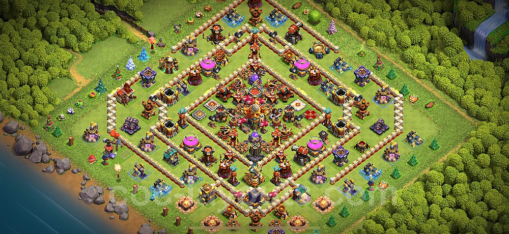 This Town Hall 16 hybrid base offers the best of both worlds - strong resource protection combined with effective trophy defense. The versatile design makes it an excellent choice for players who want to protect their loot while maintaining their trophy count. This balanced approach ensures you don't sacrifice one aspect of defense for another, making it ideal for active players across all league levels. The hybrid layout features centralized resource storages alongside a well-protected Town Hall, with multiple defensive layers that deter both farming raids and trophy pushers. High-value targets are strategically positioned within overlapping defense ranges, forcing attackers to make difficult choices about which objectives to prioritize. The compartmentalized design prevents attackers from easily achieving both loot destruction and the Town Hall kill in a single attack. Defense placement in this hybrid base creates strong coverage against both ground and air attacks. Inferno Towers, X-Bows, and Eagle Artillery work in concert to eliminate threats quickly, while splash damage defenses like Wizard Towers and Bomb Towers counter swarm strategies. The base's funnel-resistant design and strategic trap placement make it effective against popular attack strategies including QC LaLoon (Queen Charge Lava Hound Balloon), Blizzard attacks, and Yeti Smash compositions.