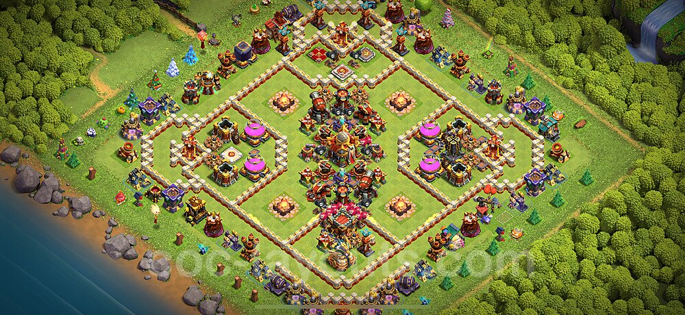 This Town Hall 16 trophy pushing base is engineered for maximum defensive capability to help you climb and maintain higher trophy leagues. The design focuses on preventing attackers from achieving the 50% destruction threshold needed to steal trophies, with a heavily fortified Town Hall position and anti-2-star compartmentalization. This layout is perfect for competitive players aiming to reach Champion, Titan, or Legend League. The strategic placement of defenses creates overlapping coverage that makes it nearly impossible for attackers to access the core without facing devastating firepower. High-DPS defenses like Inferno Towers and Eagle Artillery are positioned to protect the Town Hall from all angles, while splash damage defenses counter mass troop strategies. The anti-air coverage is exceptionally strong, with Air Defenses, Air Sweepers, and Wizard Towers positioned to eliminate aerial threats quickly. Trap placement in this trophy base is optimized to counter popular attack strategies seen in higher leagues. Spring Traps are positioned to eliminate Hog Riders and Valkyries, while Giant Bombs target Balloons and Wall Breakers. The base's asymmetrical design confuses attackers' pathing algorithms, causing troops to split and take unnecessary damage. This layout has been battle-tested in Legend League and has consistently helped players maintain their trophies against skilled attackers.