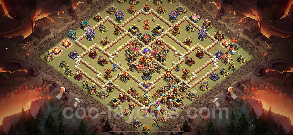 This Town Hall 16 war base is specifically designed to defend against 2-star and 3-star attacks in Clan Wars and Clan War Leagues. The strategic placement of defenses creates multiple compartments that force attackers to use more troops and spells than anticipated. Key defensive structures like Eagle Artillery, Inferno Towers, and X-Bows are positioned to cover crucial sections of the base, making it extremely difficult for opponents to secure a perfect attack. The core of this war base features a centralized Town Hall and Clan Castle, protected by multiple layers of walls and high-damage defenses. This layout forces attackers to commit significant resources just to reach the center, often leaving them without enough firepower to secure the Town Hall destruction. The anti-2-star design ensures that even if attackers breach the outer defenses, they'll struggle to achieve a 50% destruction rating. Air defenses are strategically spread to counter popular air attack strategies like LaLoon (Lava Hound + Balloons) and Electrone (Electro Dragons + Stone Slammer). The symmetrical trap placement and strategic Hidden Tesla positions create deadly surprise elements that can completely derail an attacker's plan. This base has been tested against various meta attack strategies and has consistently proven effective in preventing 3-star attacks.