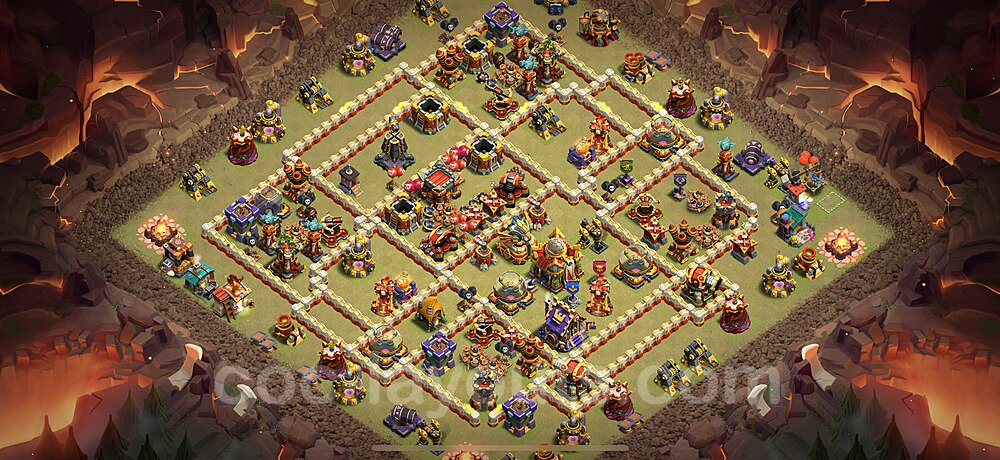 This Town Hall 16 war base is specifically designed to defend against 2-star and 3-star attacks in Clan Wars and Clan War Leagues. The strategic placement of defenses creates multiple compartments that force attackers to use more troops and spells than anticipated. Key defensive structures like Eagle Artillery, Inferno Towers, and X-Bows are positioned to cover crucial sections of the base, making it extremely difficult for opponents to secure a perfect attack. The core of this war base features a centralized Town Hall and Clan Castle, protected by multiple layers of walls and high-damage defenses. This layout forces attackers to commit significant resources just to reach the center, often leaving them without enough firepower to secure the Town Hall destruction. The anti-2-star design ensures that even if attackers breach the outer defenses, they'll struggle to achieve a 50% destruction rating. Air defenses are strategically spread to counter popular air attack strategies like LaLoon (Lava Hound + Balloons) and Electrone (Electro Dragons + Stone Slammer). The symmetrical trap placement and strategic Hidden Tesla positions create deadly surprise elements that can completely derail an attacker's plan. This base has been tested against various meta attack strategies and has consistently proven effective in preventing 3-star attacks.
