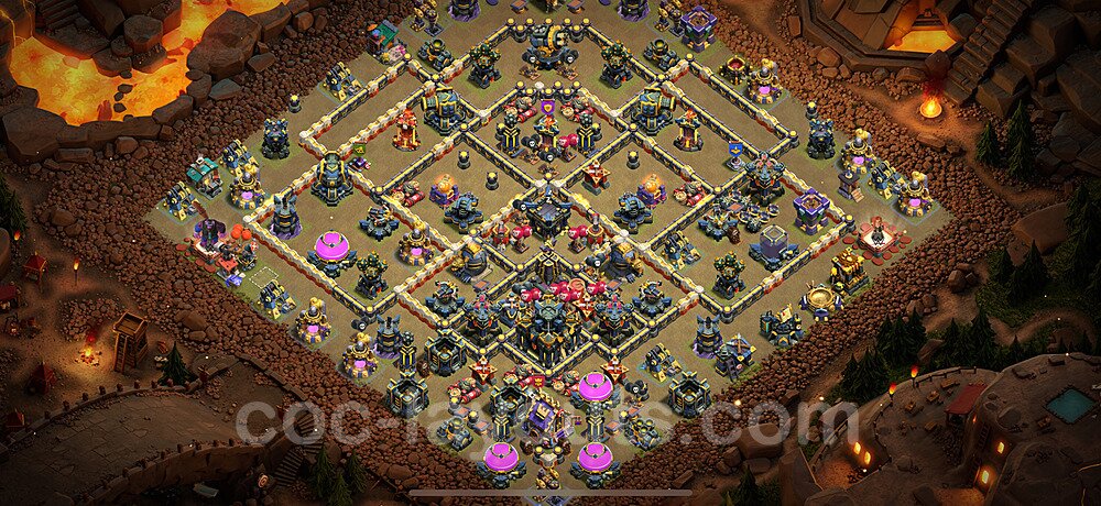 This Town Hall 17 war base is specifically designed to defend against 2-star and 3-star attacks in Clan Wars and Clan War Leagues. The strategic placement of defenses creates multiple compartments that force attackers to use more troops and spells than anticipated. Key defensive structures like Eagle Artillery, Inferno Towers, and X-Bows are positioned to cover crucial sections of the base, making it extremely difficult for opponents to secure a perfect attack. The core of this war base features a centralized Town Hall and Clan Castle, protected by multiple layers of walls and high-damage defenses. This layout forces attackers to commit significant resources just to reach the center, often leaving them without enough firepower to secure the Town Hall destruction. The anti-2-star design ensures that even if attackers breach the outer defenses, they'll struggle to achieve a 50% destruction rating. Air defenses are strategically spread to counter popular air attack strategies like LaLoon (Lava Hound + Balloons) and Electrone (Electro Dragons + Stone Slammer). The symmetrical trap placement and strategic Hidden Tesla positions create deadly surprise elements that can completely derail an attacker's plan. This base has been tested against various meta attack strategies and has consistently proven effective in preventing 3-star attacks.