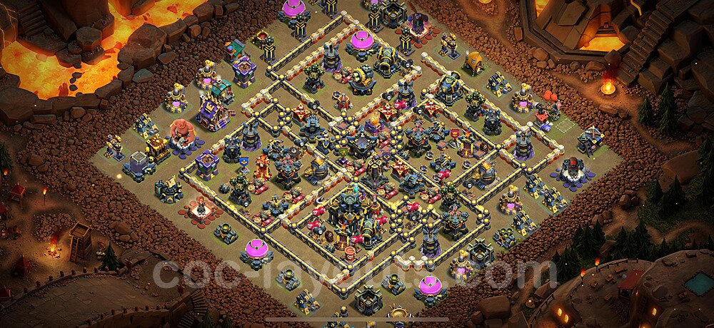 This Town Hall 17 war base is specifically designed to defend against 2-star and 3-star attacks in Clan Wars and Clan War Leagues. The strategic placement of defenses creates multiple compartments that force attackers to use more troops and spells than anticipated. Key defensive structures like Eagle Artillery, Inferno Towers, and X-Bows are positioned to cover crucial sections of the base, making it extremely difficult for opponents to secure a perfect attack. The core of this war base features a centralized Town Hall and Clan Castle, protected by multiple layers of walls and high-damage defenses. This layout forces attackers to commit significant resources just to reach the center, often leaving them without enough firepower to secure the Town Hall destruction. The anti-2-star design ensures that even if attackers breach the outer defenses, they'll struggle to achieve a 50% destruction rating. Air defenses are strategically spread to counter popular air attack strategies like LaLoon (Lava Hound + Balloons) and Electrone (Electro Dragons + Stone Slammer). The symmetrical trap placement and strategic Hidden Tesla positions create deadly surprise elements that can completely derail an attacker's plan. This base has been tested against various meta attack strategies and has consistently proven effective in preventing 3-star attacks.