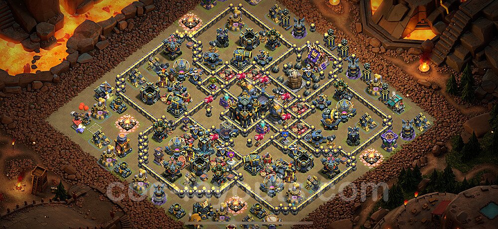 This Town Hall 17 hybrid base offers the best of both worlds - strong resource protection combined with effective trophy defense. The versatile design makes it an excellent choice for players who want to protect their loot while maintaining their trophy count. This balanced approach ensures you don't sacrifice one aspect of defense for another, making it ideal for active players across all league levels. The hybrid layout features centralized resource storages alongside a well-protected Town Hall, with multiple defensive layers that deter both farming raids and trophy pushers. High-value targets are strategically positioned within overlapping defense ranges, forcing attackers to make difficult choices about which objectives to prioritize. The compartmentalized design prevents attackers from easily achieving both loot destruction and the Town Hall kill in a single attack. Defense placement in this hybrid base creates strong coverage against both ground and air attacks. Inferno Towers, X-Bows, and Eagle Artillery work in concert to eliminate threats quickly, while splash damage defenses like Wizard Towers and Bomb Towers counter swarm strategies. The base's funnel-resistant design and strategic trap placement make it effective against popular attack strategies including QC LaLoon (Queen Charge Lava Hound Balloon), Blizzard attacks, and Yeti Smash compositions.