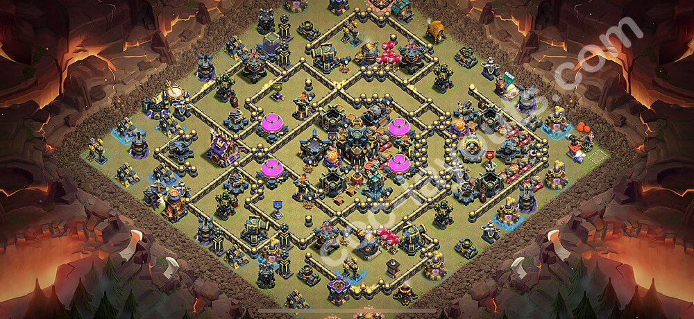 This Town Hall 17 war base is specifically designed to defend against 2-star and 3-star attacks in Clan Wars and Clan War Leagues. The strategic placement of defenses creates multiple compartments that force attackers to use more troops and spells than anticipated. Key defensive structures like Eagle Artillery, Inferno Towers, and X-Bows are positioned to cover crucial sections of the base, making it extremely difficult for opponents to secure a perfect attack. The core of this war base features a centralized Town Hall and Clan Castle, protected by multiple layers of walls and high-damage defenses. This layout forces attackers to commit significant resources just to reach the center, often leaving them without enough firepower to secure the Town Hall destruction. The anti-2-star design ensures that even if attackers breach the outer defenses, they'll struggle to achieve a 50% destruction rating. Air defenses are strategically spread to counter popular air attack strategies like LaLoon (Lava Hound + Balloons) and Electrone (Electro Dragons + Stone Slammer). The symmetrical trap placement and strategic Hidden Tesla positions create deadly surprise elements that can completely derail an attacker's plan. This base has been tested against various meta attack strategies and has consistently proven effective in preventing 3-star attacks.