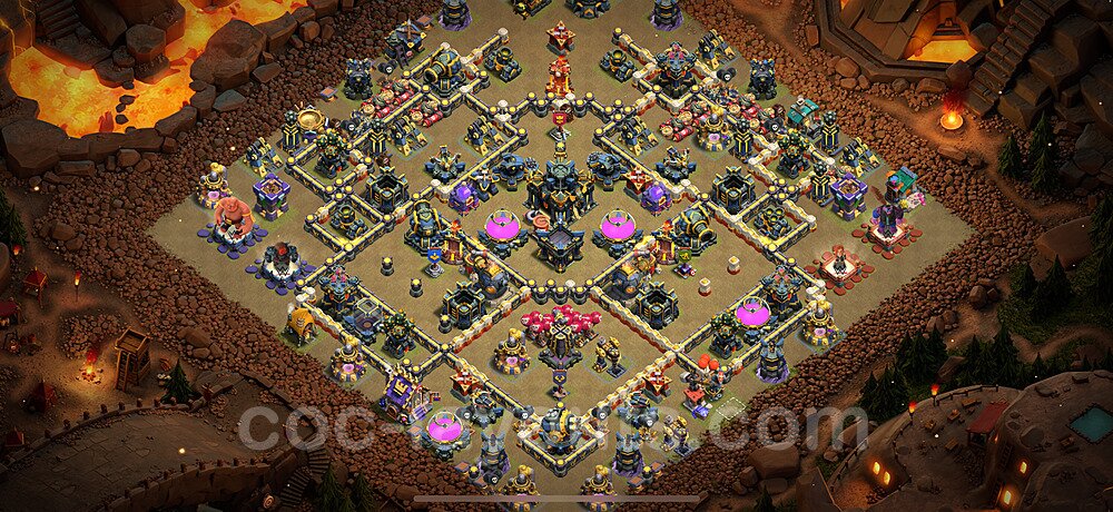 This Town Hall 17 war base is specifically designed to defend against 2-star and 3-star attacks in Clan Wars and Clan War Leagues. The strategic placement of defenses creates multiple compartments that force attackers to use more troops and spells than anticipated. Key defensive structures like Eagle Artillery, Inferno Towers, and X-Bows are positioned to cover crucial sections of the base, making it extremely difficult for opponents to secure a perfect attack. The core of this war base features a centralized Town Hall and Clan Castle, protected by multiple layers of walls and high-damage defenses. This layout forces attackers to commit significant resources just to reach the center, often leaving them without enough firepower to secure the Town Hall destruction. The anti-2-star design ensures that even if attackers breach the outer defenses, they'll struggle to achieve a 50% destruction rating. Air defenses are strategically spread to counter popular air attack strategies like LaLoon (Lava Hound + Balloons) and Electrone (Electro Dragons + Stone Slammer). The symmetrical trap placement and strategic Hidden Tesla positions create deadly surprise elements that can completely derail an attacker's plan. This base has been tested against various meta attack strategies and has consistently proven effective in preventing 3-star attacks.