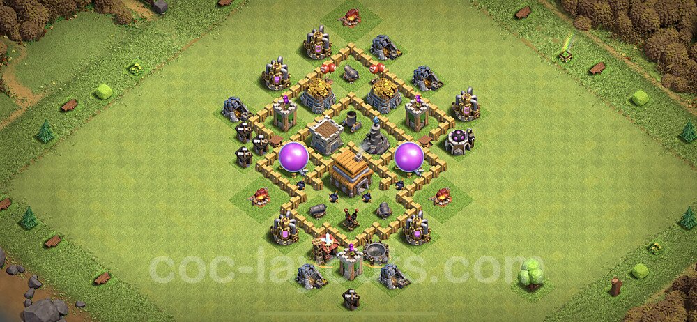 This Town Hall 5 hybrid base offers the best of both worlds - strong resource protection combined with effective trophy defense. The versatile design makes it an excellent choice for players who want to protect their loot while maintaining their trophy count. This balanced approach ensures you don't sacrifice one aspect of defense for another, making it ideal for active players across all league levels. The hybrid layout features centralized resource storages alongside a well-protected Town Hall, with multiple defensive layers that deter both farming raids and trophy pushers. High-value targets are strategically positioned within overlapping defense ranges, forcing attackers to make difficult choices about which objectives to prioritize. The compartmentalized design prevents attackers from easily achieving both loot destruction and the Town Hall kill in a single attack. Defense placement in this hybrid base creates strong coverage against both ground and air attacks. Inferno Towers, X-Bows, and Eagle Artillery work in concert to eliminate threats quickly, while splash damage defenses like Wizard Towers and Bomb Towers counter swarm strategies. The base's funnel-resistant design and strategic trap placement make it effective against popular attack strategies including QC LaLoon (Queen Charge Lava Hound Balloon), Blizzard attacks, and Yeti Smash compositions.
