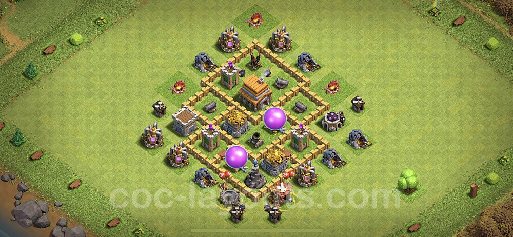 This Town Hall 5 hybrid base offers the best of both worlds - strong resource protection combined with effective trophy defense. The versatile design makes it an excellent choice for players who want to protect their loot while maintaining their trophy count. This balanced approach ensures you don't sacrifice one aspect of defense for another, making it ideal for active players across all league levels. The hybrid layout features centralized resource storages alongside a well-protected Town Hall, with multiple defensive layers that deter both farming raids and trophy pushers. High-value targets are strategically positioned within overlapping defense ranges, forcing attackers to make difficult choices about which objectives to prioritize. The compartmentalized design prevents attackers from easily achieving both loot destruction and the Town Hall kill in a single attack. Defense placement in this hybrid base creates strong coverage against both ground and air attacks. Inferno Towers, X-Bows, and Eagle Artillery work in concert to eliminate threats quickly, while splash damage defenses like Wizard Towers and Bomb Towers counter swarm strategies. The base's funnel-resistant design and strategic trap placement make it effective against popular attack strategies including QC LaLoon (Queen Charge Lava Hound Balloon), Blizzard attacks, and Yeti Smash compositions.