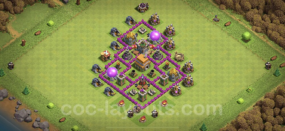 This Town Hall 6 war base is specifically designed to defend against 2-star and 3-star attacks in Clan Wars and Clan War Leagues. The strategic placement of defenses creates multiple compartments that force attackers to use more troops and spells than anticipated. Key defensive structures like Eagle Artillery, Inferno Towers, and X-Bows are positioned to cover crucial sections of the base, making it extremely difficult for opponents to secure a perfect attack. The core of this war base features a centralized Town Hall and Clan Castle, protected by multiple layers of walls and high-damage defenses. This layout forces attackers to commit significant resources just to reach the center, often leaving them without enough firepower to secure the Town Hall destruction. The anti-2-star design ensures that even if attackers breach the outer defenses, they'll struggle to achieve a 50% destruction rating. Air defenses are strategically spread to counter popular air attack strategies like LaLoon (Lava Hound + Balloons) and Electrone (Electro Dragons + Stone Slammer). The symmetrical trap placement and strategic Hidden Tesla positions create deadly surprise elements that can completely derail an attacker's plan. This base has been tested against various meta attack strategies and has consistently proven effective in preventing 3-star attacks.