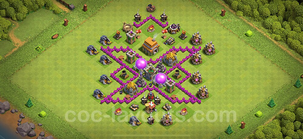 This Town Hall 6 war base is specifically designed to defend against 2-star and 3-star attacks in Clan Wars and Clan War Leagues. The strategic placement of defenses creates multiple compartments that force attackers to use more troops and spells than anticipated. Key defensive structures like Eagle Artillery, Inferno Towers, and X-Bows are positioned to cover crucial sections of the base, making it extremely difficult for opponents to secure a perfect attack. The core of this war base features a centralized Town Hall and Clan Castle, protected by multiple layers of walls and high-damage defenses. This layout forces attackers to commit significant resources just to reach the center, often leaving them without enough firepower to secure the Town Hall destruction. The anti-2-star design ensures that even if attackers breach the outer defenses, they'll struggle to achieve a 50% destruction rating. Air defenses are strategically spread to counter popular air attack strategies like LaLoon (Lava Hound + Balloons) and Electrone (Electro Dragons + Stone Slammer). The symmetrical trap placement and strategic Hidden Tesla positions create deadly surprise elements that can completely derail an attacker's plan. This base has been tested against various meta attack strategies and has consistently proven effective in preventing 3-star attacks.