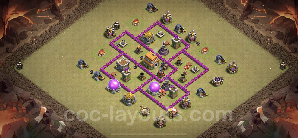 This Town Hall 6 war base is specifically designed to defend against 2-star and 3-star attacks in Clan Wars and Clan War Leagues. The strategic placement of defenses creates multiple compartments that force attackers to use more troops and spells than anticipated. Key defensive structures like Eagle Artillery, Inferno Towers, and X-Bows are positioned to cover crucial sections of the base, making it extremely difficult for opponents to secure a perfect attack. The core of this war base features a centralized Town Hall and Clan Castle, protected by multiple layers of walls and high-damage defenses. This layout forces attackers to commit significant resources just to reach the center, often leaving them without enough firepower to secure the Town Hall destruction. The anti-2-star design ensures that even if attackers breach the outer defenses, they'll struggle to achieve a 50% destruction rating. Air defenses are strategically spread to counter popular air attack strategies like LaLoon (Lava Hound + Balloons) and Electrone (Electro Dragons + Stone Slammer). The symmetrical trap placement and strategic Hidden Tesla positions create deadly surprise elements that can completely derail an attacker's plan. This base has been tested against various meta attack strategies and has consistently proven effective in preventing 3-star attacks.